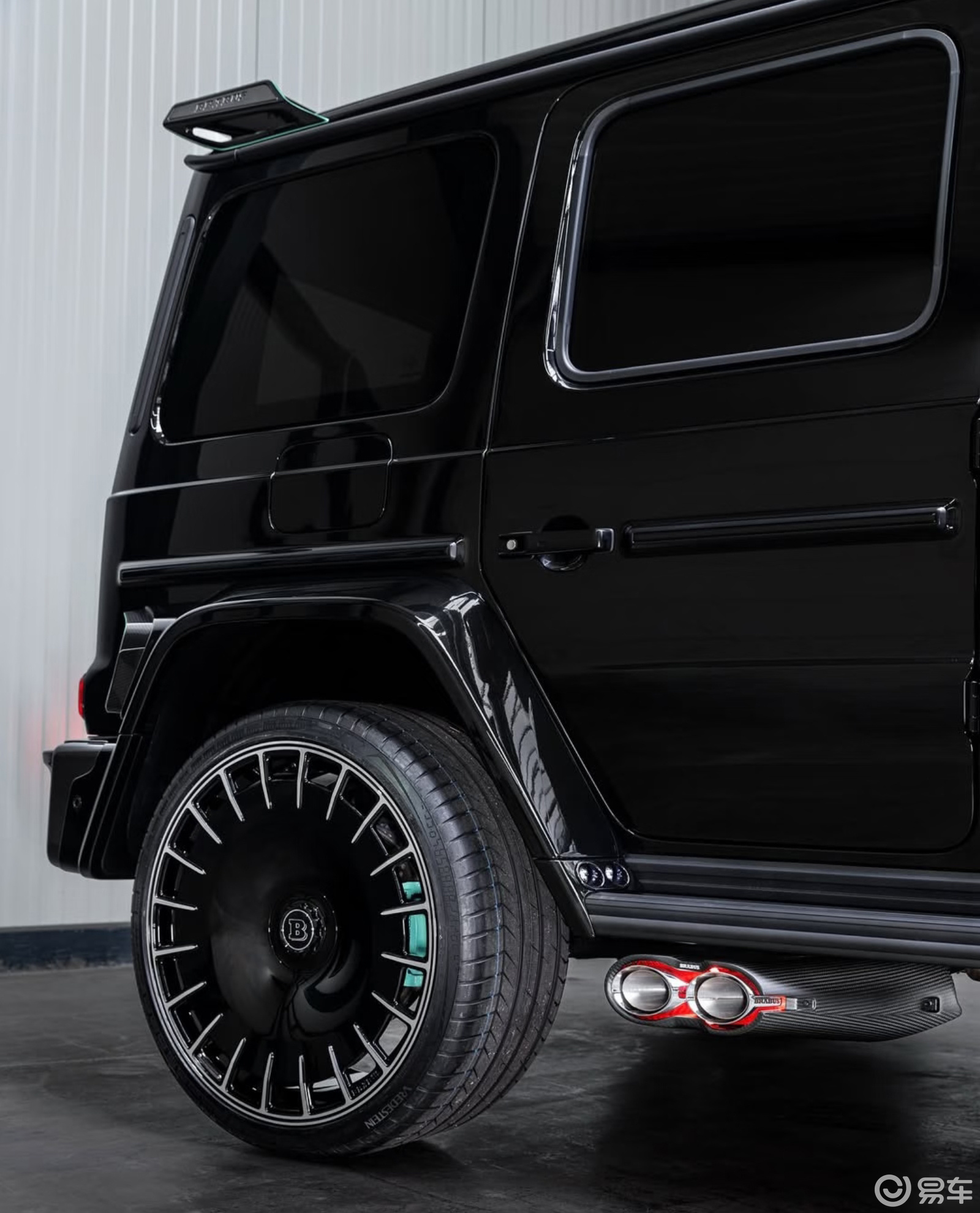 为了进一步强化奔驰 G 级的硬派风格,改装团队为其加装了一套定制的碳纤维车身套件。像车身侧面的翼子板处,加入了带有荧光绿饰条点缀的碳纤维部件,不仅增强了车辆的立体感,还增添了几分时尚感与科技感。车尾部分,全新的后包围设计搭配上独特造型的尾灯,让整车的尾部看起来更加饱满且富有层次感。另外,车顶的扰流板,不仅在造型上与整车风格完美融合,还能在高速行驶时提供更好的空气动力学性能 。