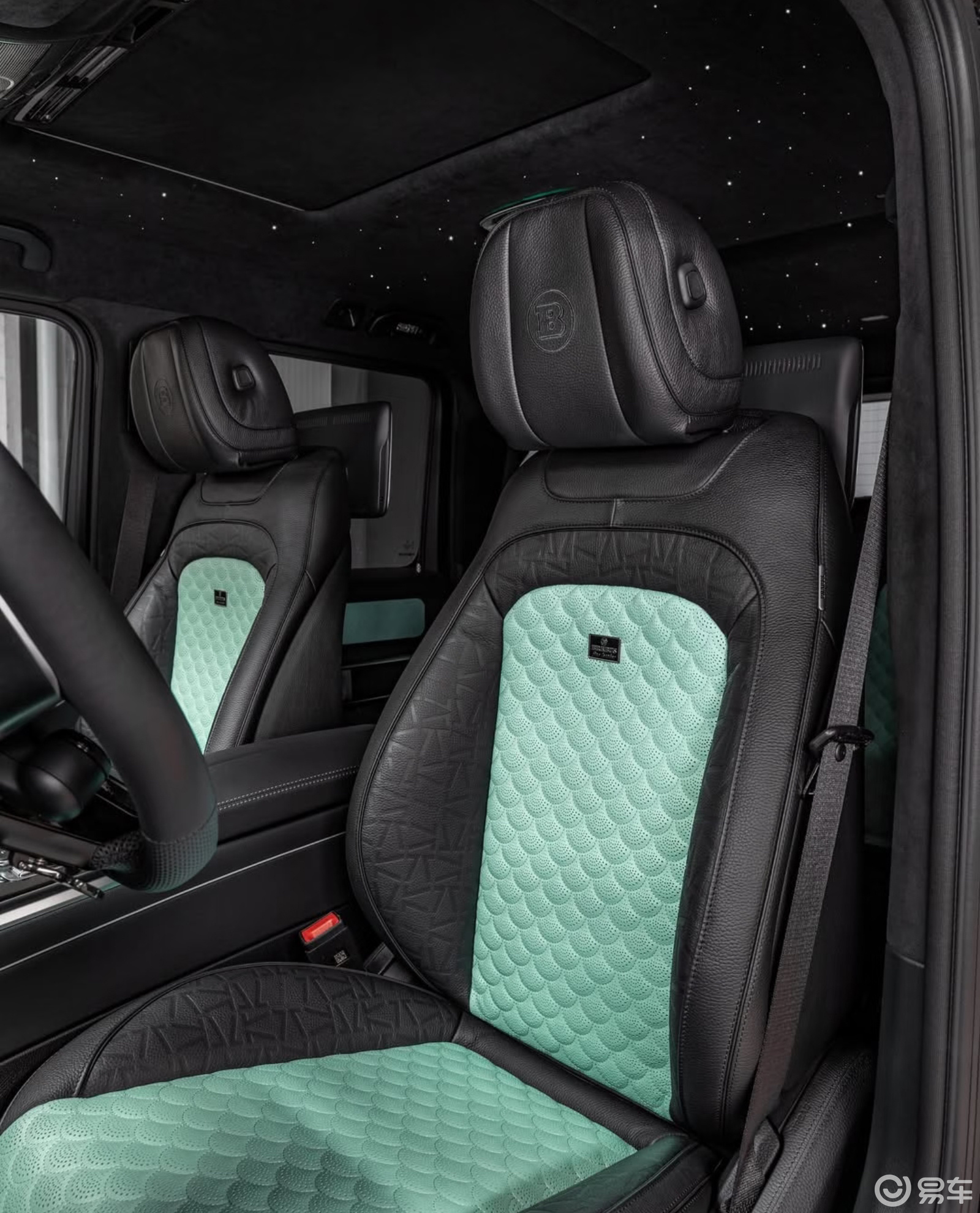 走进车内,首先映入眼帘的是经过重新设计的座椅。原车座椅的风格相对传统,而改装后的座椅采用了黑色与荧光绿的撞色搭配,黑色的真皮材质搭配上荧光绿的菱形格纹区域,视觉上极具冲击力。而且,座椅的人体工程学设计更加出色,对身体的支撑性更好,无论是长途驾驶还是越野颠簸路段,都能让驾乘者感受到极致的舒适。同时,座椅上还带有专属的品牌标识,进一步提升了内饰的豪华感与独特性。