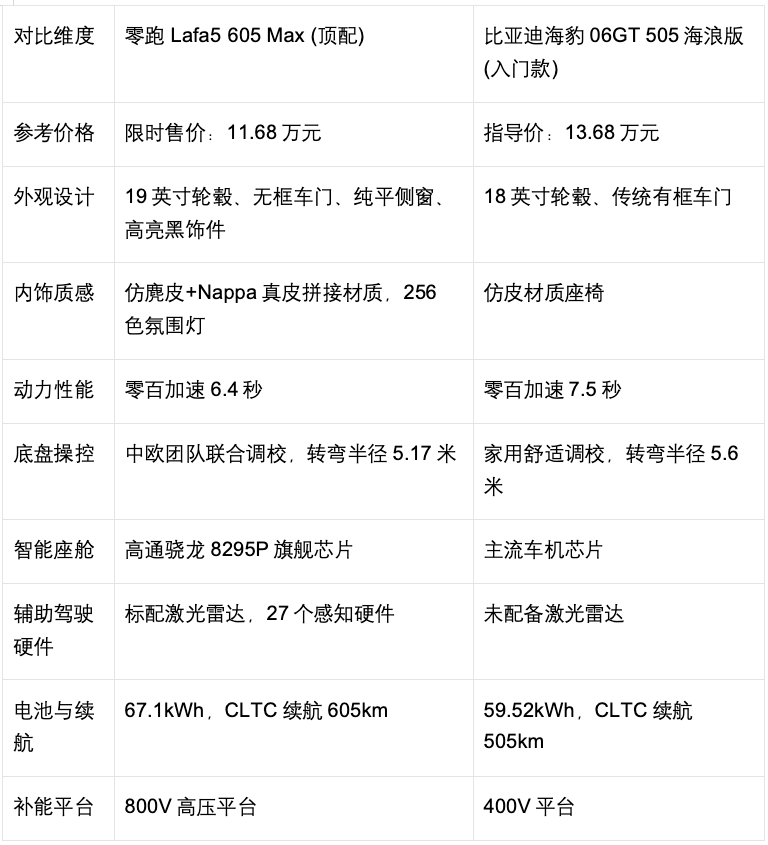 对于年轻人购车来说,智能化表现同样也是重点考核指标。这个我觉得咱们得连着价格一起聊才有意义。Lafa5年底前的政策是9.28万起售,605 Max顶配版也才仅需11.68万元。就能拥有包含激光雷达的高阶智能驾驶辅助系统、8295P旗舰芯片、Nappa真皮拼接内饰以及超长续航。而海豹06 GT虽然产品力也不弱,但考虑到其13.68万元起顶配接近20万的价格,显然,Lafa5更友好。