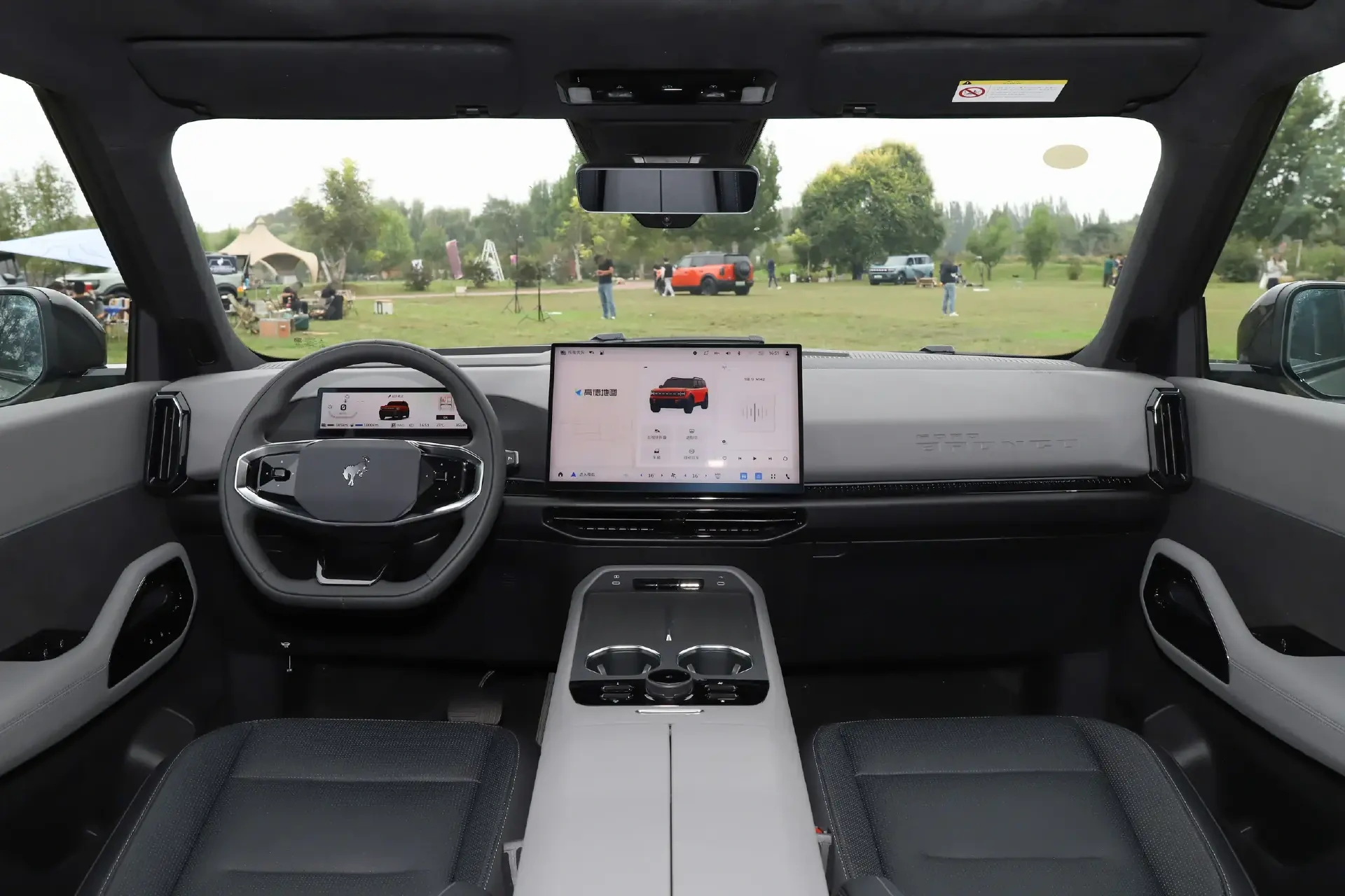 再进入到座舱,撞色的三辐式方向盘可以实现全真皮包覆,副驾装饰面板的软包中带有BRONCO身份标识,而多区域的烤漆包边、顶棚的翻毛材质等等,都证明了车辆在档次方面并不低。此外,副仪表台上旋钮+按键的组合,也能让常用功能变得更易调节。尽管驾驶舱还是以双悬浮屏幕为主,可这里的装饰效果与实用性都没有被忽略。