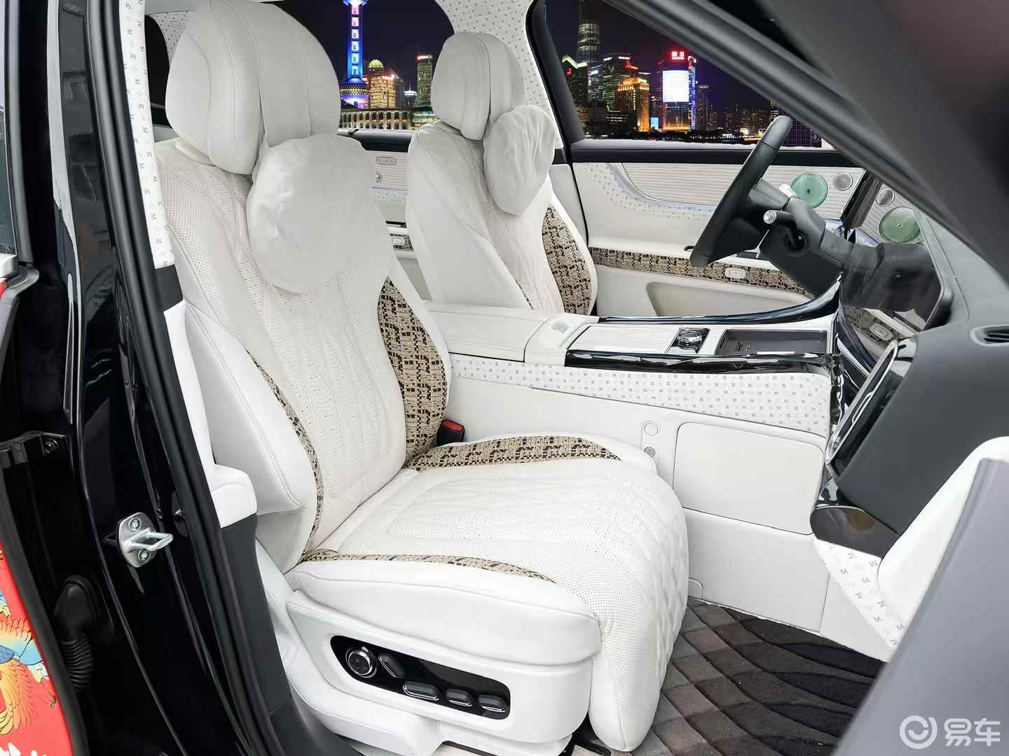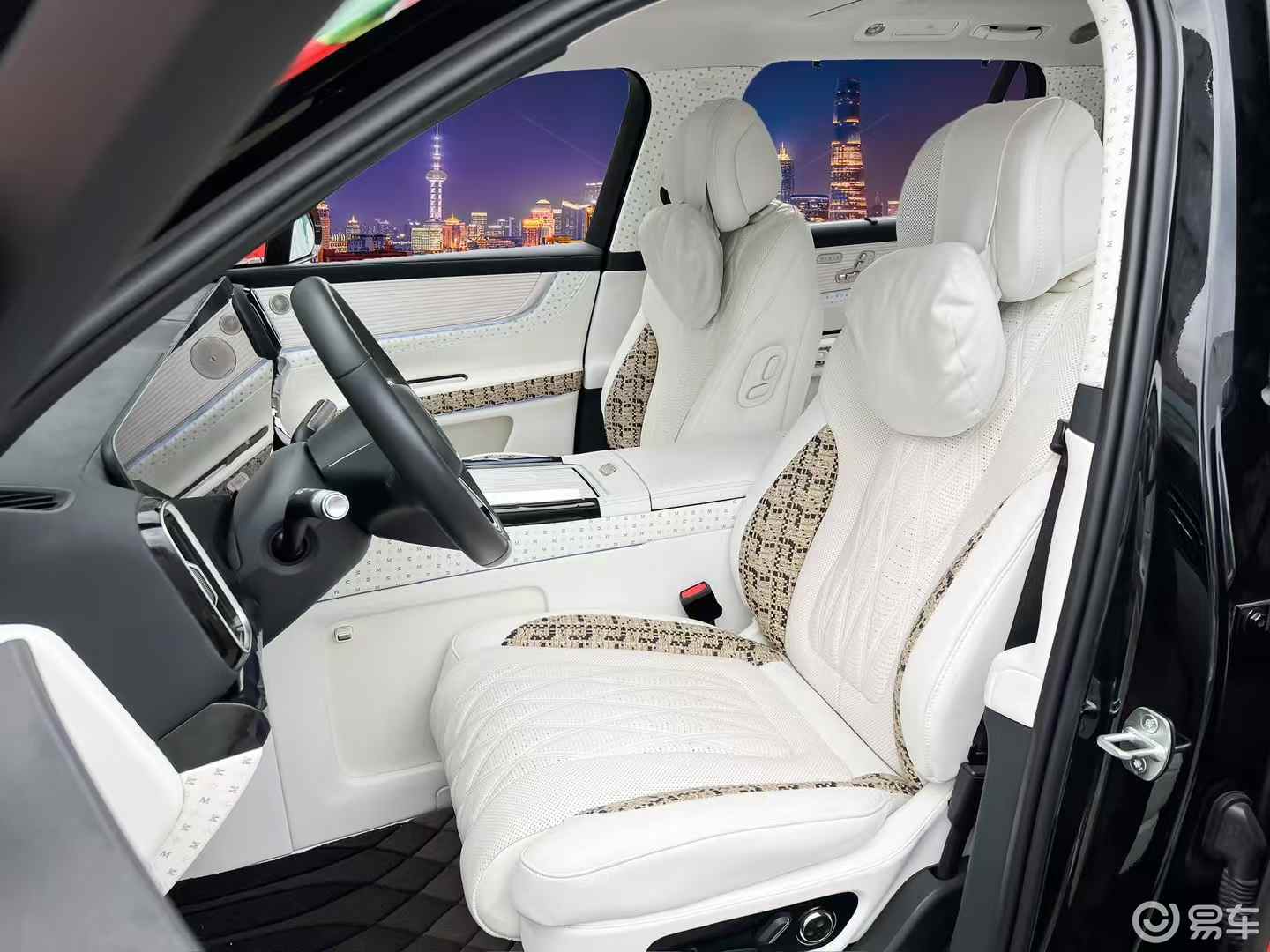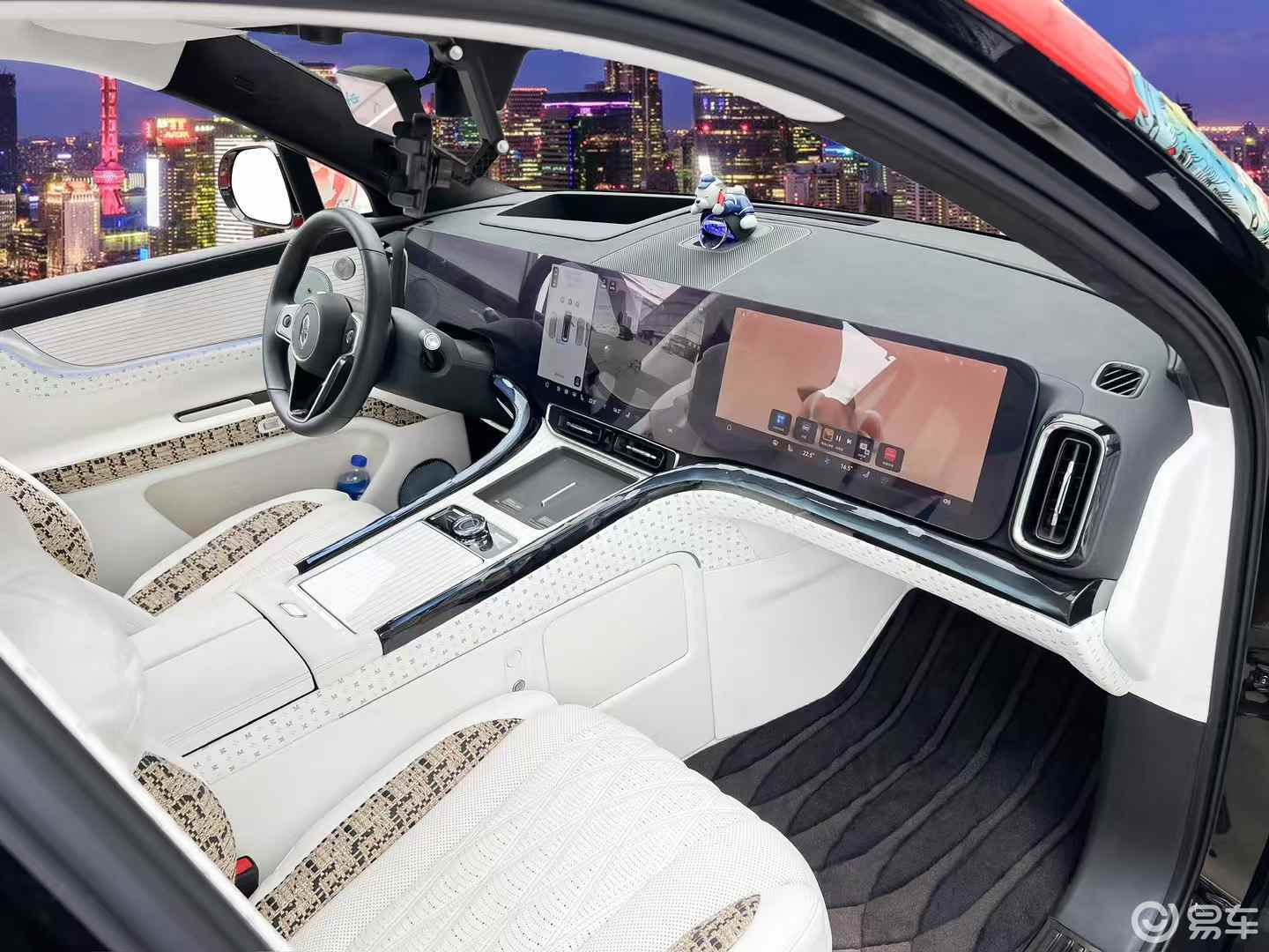 视觉暴击:白到发光的氛围感,谁看了不迷糊?白色内饰 + 都市夜景背景,直接美成 “移动的月光城堡”!
