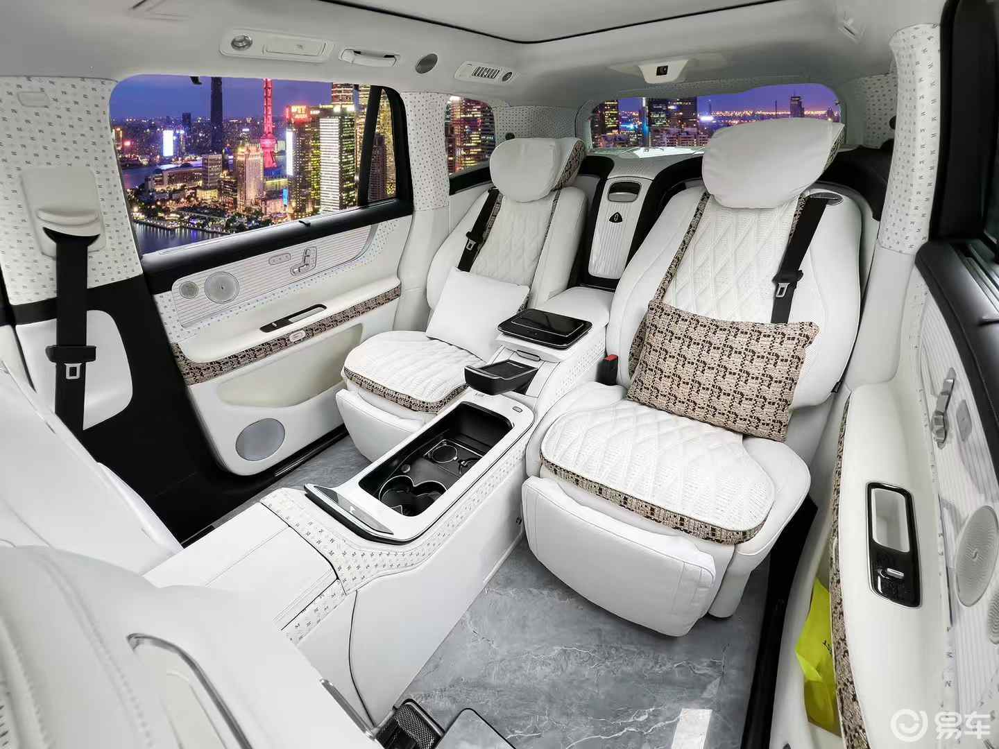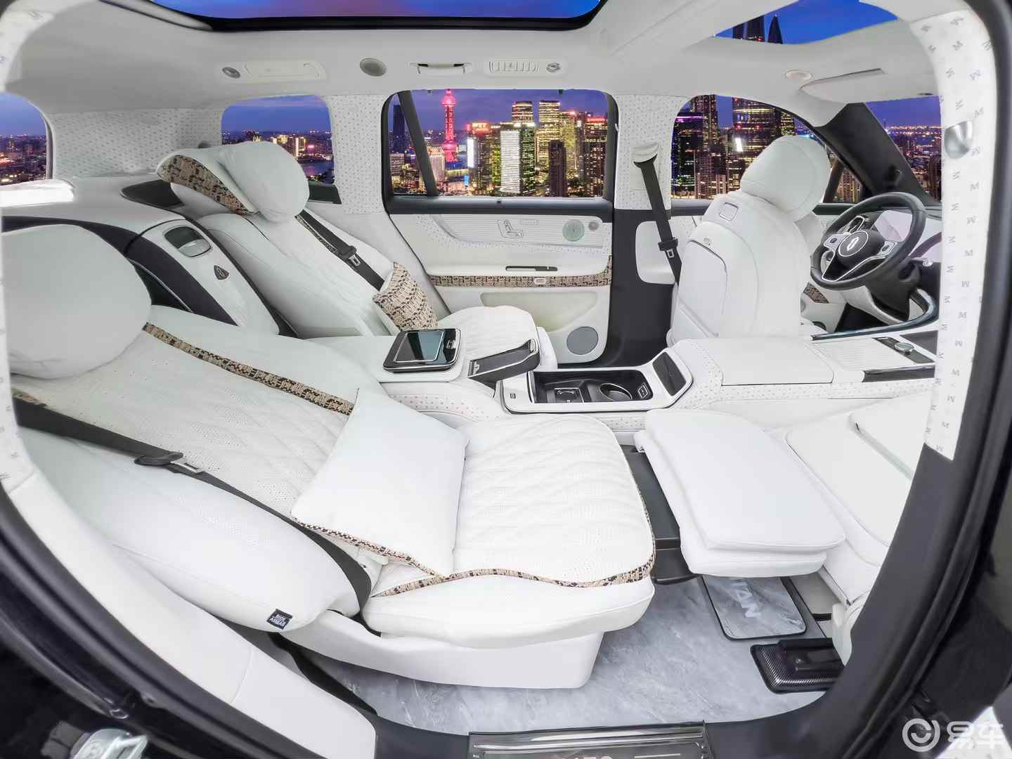 最戳人的是 **“定制级专属感”**—— 四座布局让每个座位都是 C 位,再也不用纠结 “谁坐中间”;头枕的定制刺绣、扶手箱的专属杯架、后备箱的精致地毯…… 上车就像收到 “私人礼物”,连堵车都变成 “沉浸式享受”。
