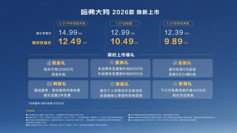 7月17日,2026款哈弗大狗正式上市,全系共推出3款车型,官方指导价格区间为12.39万-14.99万元,在叠加哈弗品牌官方购车权益之后,限时权益价格为9.89万-12.49万元。而在新的价格吸引力之外,更多的可玩性成为新款哈弗大狗的看点所在。