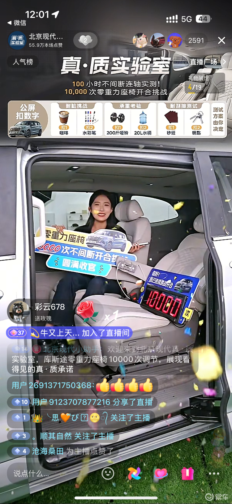 测试中,北京现代通过电动装置模拟高频使用场景,连续开合座椅10000次。按每天使用8次计算,相当于用户3年多的使用量;若以普通家庭用车频率估算,则覆盖了8-10年的生命周期。更“狠”的是,测试中还加入了泼洒咖啡、砂纸摩擦、放置200斤重物等极端条件,全程无剪辑直播,最终座椅仍保持轨道稳定、运行流畅,无变形或噪音。