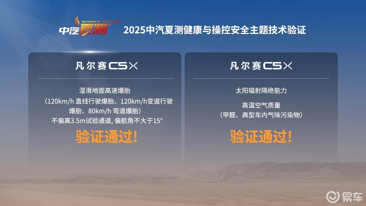 7月21日,东风雪铁龙凡尔赛C5 X参加2025中汽夏测健康与操控安全主题技术验证,荣获中汽夏测健康与操控双安全权威验证证书。