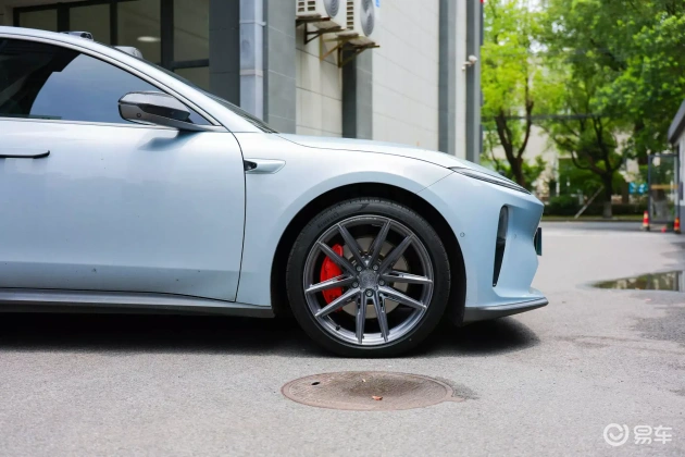 在色彩哲学上,拉丝枪灰色与同温层蓝车漆形成绝妙搭配。它既非高调炫目的亮银,亦非过于沉闷的深黑。拉丝工艺赋予了其细腻的金属质感和纵向纹理,在光线下展现出低调而高级的光泽。枪灰色的冷峻深邃与ET5T的优雅科技感同温层蓝相得益彰,形成和谐且富有层次的对比。这不仅强化了车辆的运动氛围,还保持了整车格调的统一与内敛的锋芒。行驶于都市楼宇间,ET5T自成一道深邃而充满力量的风景线。
