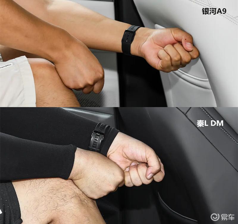 身高1米75左右的男性用户,坐在后排,从图片上也能看得出来,银河A7的腿部空间明显更宽敞,足足有三拳多,能轻松翘起二郎腿,而秦L DM-i的后排腿部空间只有两拳。