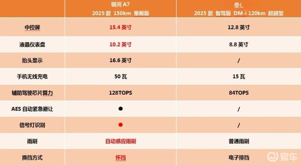 此外,银河A7搭载了2.5K分辨率的15.4英寸多媒体屏幕,液晶仪表盘尺寸为10.2英寸,而秦L DM-i的中控屏尺寸为12.8英寸,液晶仪表盘尺寸为8.8英寸,车机相对来说不如银河A7。