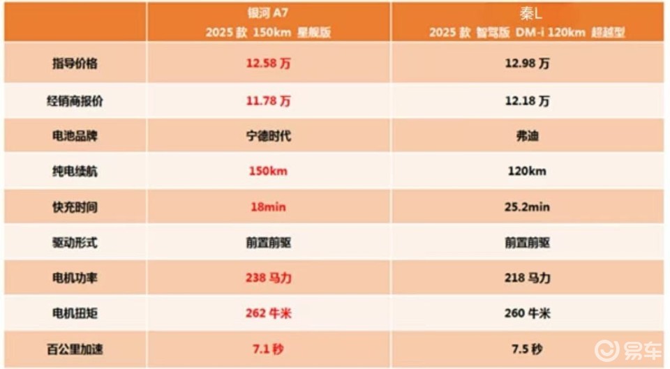 为了公平起见,我们对比的是银河A7 2025款 150km 星舰版和秦L DM-i 2025款 智驾版 DM-i 120km 超越型,银河A7的厂商指导价格为12.58万,经销商报价为11.78万,优惠幅度多达8000元,还有价值8000元的16扬声器、7500元的高速高架NOA、终身基础流量费、3990元充电桩、终身质保等免费服务,性价比确实拉满了。