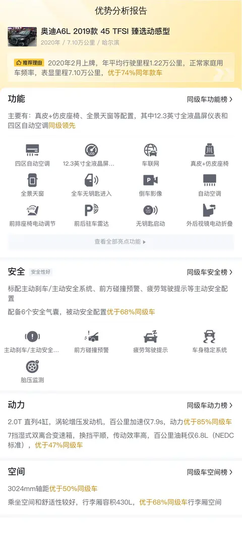 这辆奥迪A6L 2019款 45 TFSI 臻选动感型在配置、动力、空间上都有一定的优势,唯一可能不太好的地方就是有过一次过户记录。