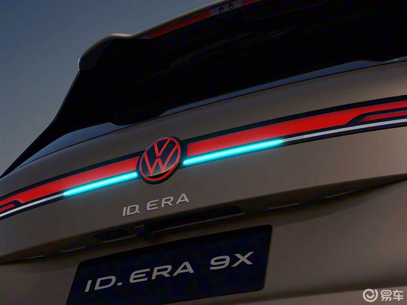 上汽大众ID.ERA 9X的尾部高大,呈现出下宽上窄的造型,在车顶末端配备了扰流板和高位刹车灯,细长的贯穿式尾灯与前灯组做到了呼应,同时尾标也可点亮,下方有“ID.ERA”标识,后包围加入高亮黑色装饰件。