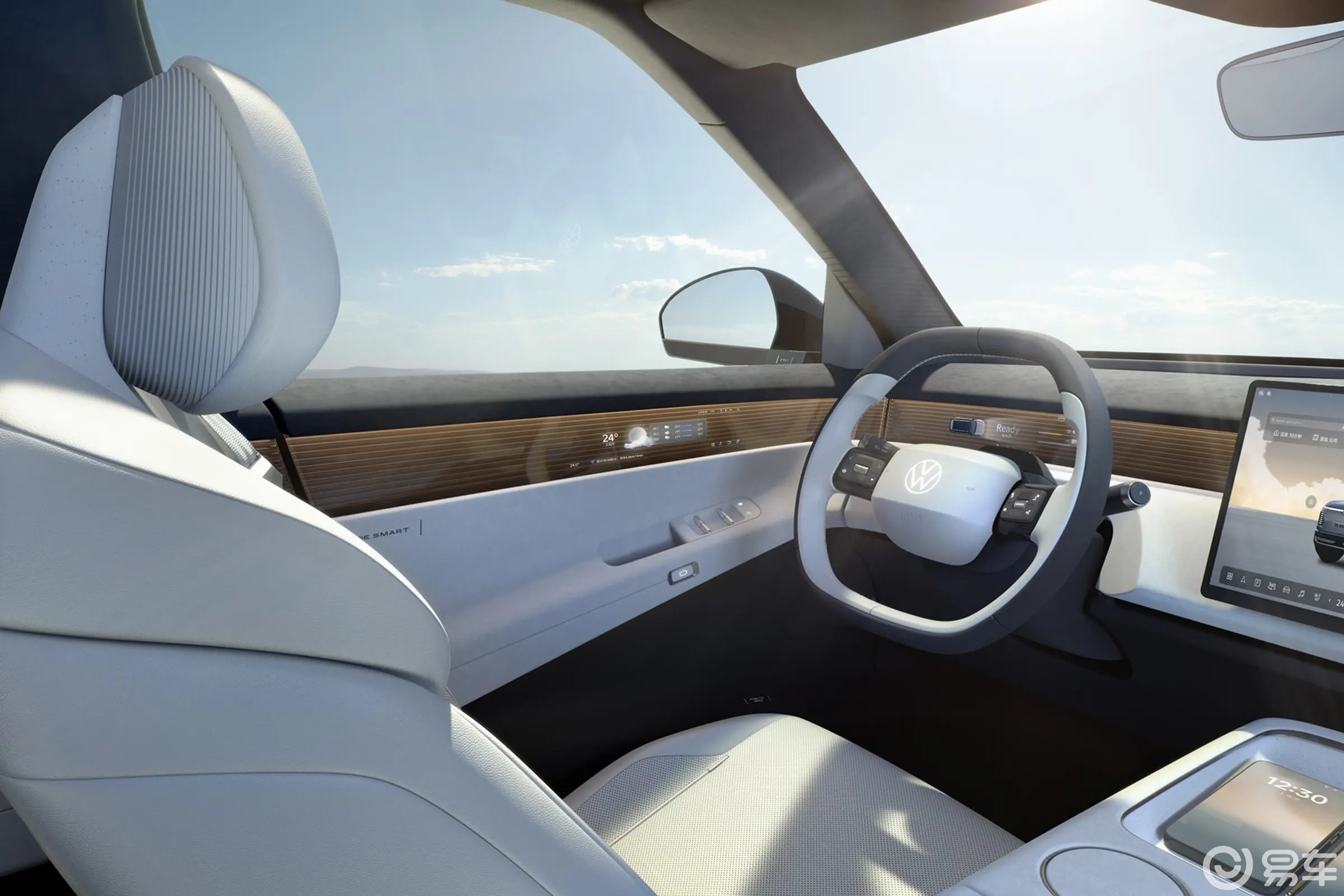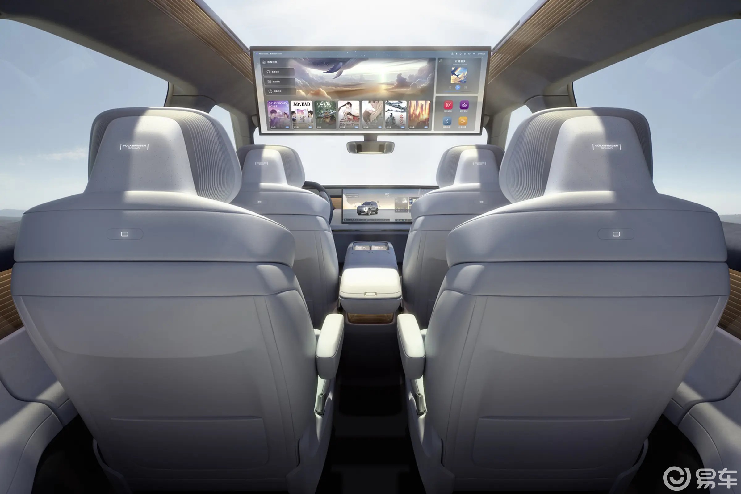 上汽大众ID.ERA 9X的内饰还未曝光,预计会使用ID.ERA概念车的这套设计,座舱为环抱布局,,配备有上下平底式方向盘以及中控+副驾双联屏,车机融入AI语音大模型,副仪表台位置设计有手机无线充电,此外车门内侧可显示天气等信息,车内采用2+2+2的6座布局,每一排都能获得充足的乘坐空间,女王副驾带有电动腿托,第二排配备“行政座椅”及吸顶娱乐屏等。