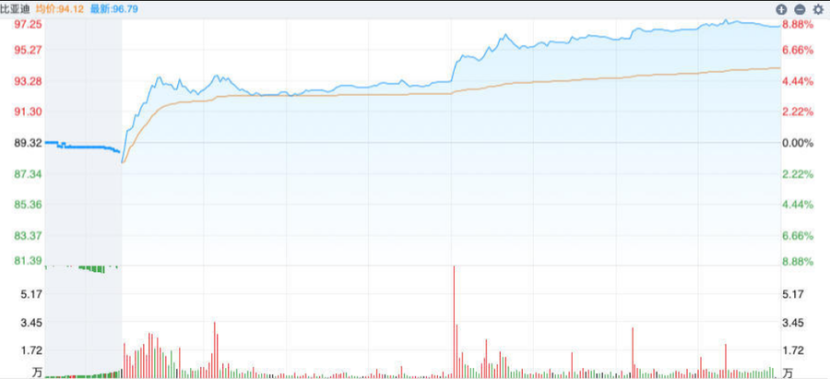 3月2日比亚迪(002594.SZ)股价仅以开盘小幅下跌1.48%回应了昨日的销量下滑,随后其股价快速拉升,上午最高涨幅一度达到4.85%至每股93.65元。午后开盘,比亚迪A股价继续震荡上行,最高涨幅达到8.87%至每股97.24元。截至当日收盘,比亚迪A股股价涨幅达8.36%,每股股价96.79元。