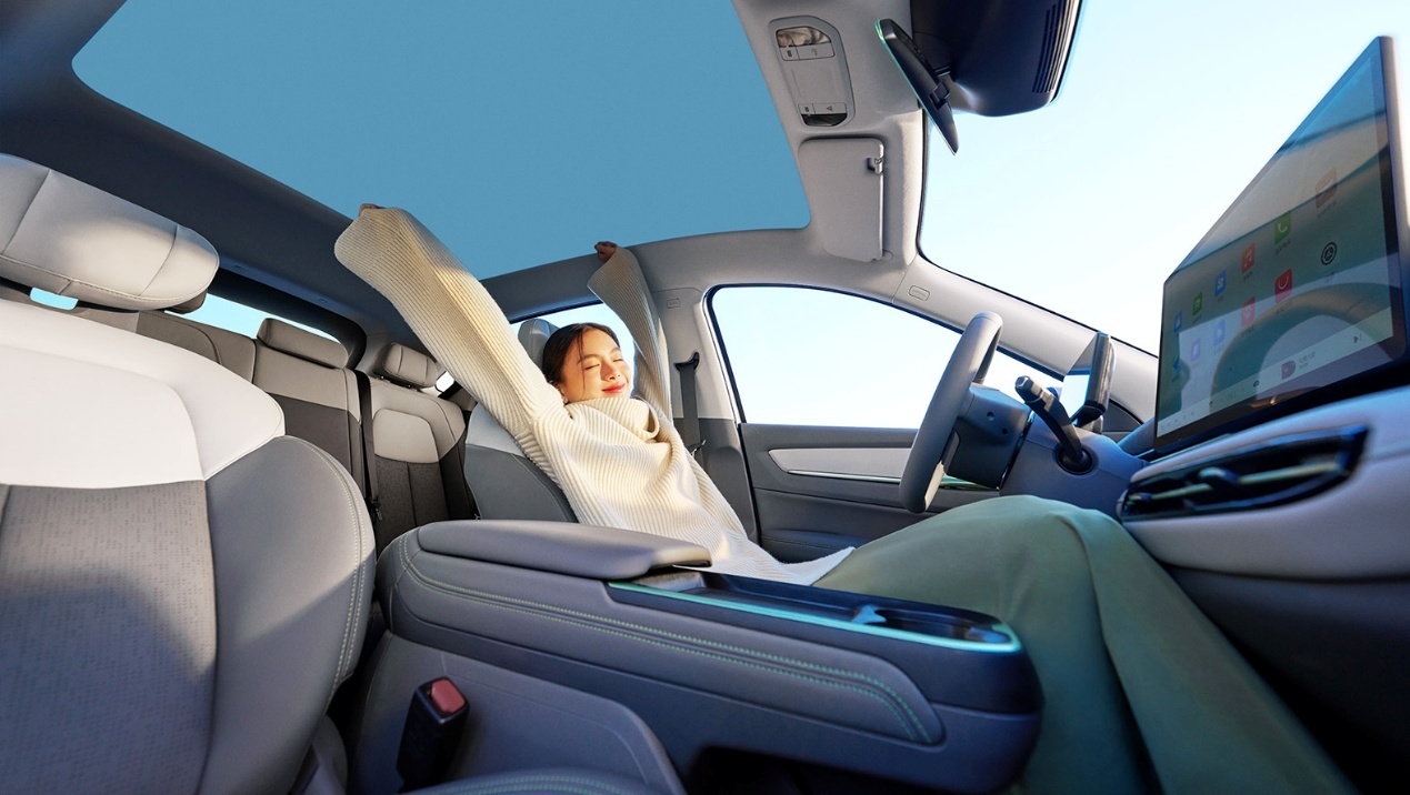 当然,悦意03的“舒适”远不止于表面,更体现在对家人无微不至的体察中。针对家庭出行的核心场景,新车在舒适性上进行了“饱和式”配置下放。后排座椅特意增加了15mm的软泡层,既柔软贴合又支撑扎实,有效化解了“孩子坐不住、老人容易累”的旅途痛点。前排更是配备了座椅加热及主驾通风功能,无论冬夏,都能为驾驶者提供恰到好处的温润。为了让“她”开车更从容,新车不仅标配了360°全景影像,让窄路会车和一把入库成为常态,更新增了并线辅助与盲区监测,用科技为每一次变道保驾护航。甚至在细节上,外后视镜的电动折叠与加热、NFC/蓝牙钥匙的加入,都让日常用车摆脱了繁琐的小动作,抱娃腾不出手时,手机一贴车门即开,这份细腻,正是对家庭用户最真实的懂得。