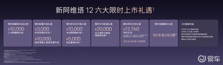 双车差异化定位,互补优势,全维度覆盖出行需求。新阿维塔12定位未来智能豪华轿车,面向时代精英人群,主打豪华、智能、旗舰级出行体验。新车全系标配12项顶格配置,涵盖华为乾崑智驾全系统、太行智控2.0、35.4英寸4K全景星环屏、25扬英国之宝音响、全车9安全气囊等,百万豪车顶配选装功能悉数成为标配。同时,还推出了六大限时购车礼遇,包括购置税补贴、配置升级、老车主升级、ADS高阶包抵扣权益、贷5年首2年0息金融礼遇以及万元用车无忧礼遇,入门即满配,彻底打破了豪华门槛。