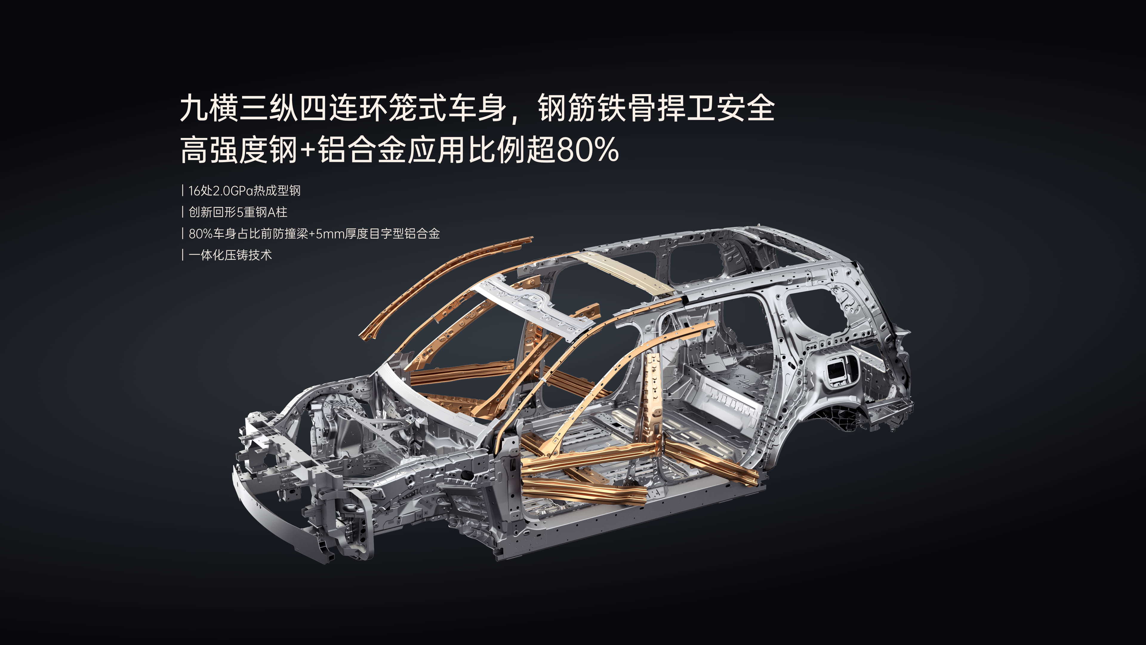 公开信息提到:车身结构采用笼式思路,并强调全车16处2000MPa(2GPa)热成型钢应用。